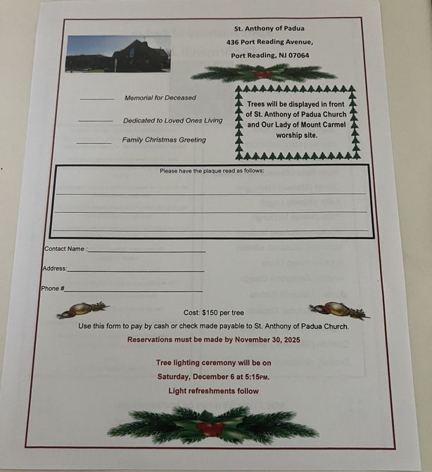 The Parish Family of Saint Anthony of Padua is a diverse Community of Faith formed in July 2012 by the merging of Our Lady of Mount Carmel Church, Woodbridge (est. 1920) with Saint Anthony of Padua Church, Port Reading (est. 1904).